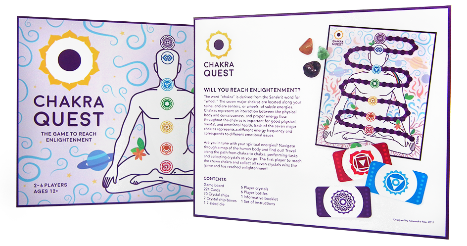 Designed for Michael Gerbino’s Graphic Design Senior Project class, Chakra Quest: The Game to Reach Enlightenment is a board game for ages 12 and up. The game strives to teach players about the seven major chakras and help them become more in tune with their spiritual energies. Players navigate through a map of the human body, traveling from chakra to chakra, performing various tasks and collecting crystals as they go. The first player to reach the crown chakra and collect all seven crystals has “reached enlightenment” and wins the game!